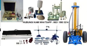 Slump Test Set, Cetakan Beton, Oven dan Curing Tank untuk perawatan sampel, serta alat untuk pengujian material bahan seperti Sieve Shaker dan Los Angeles Abrasion Machine untuk agregat.